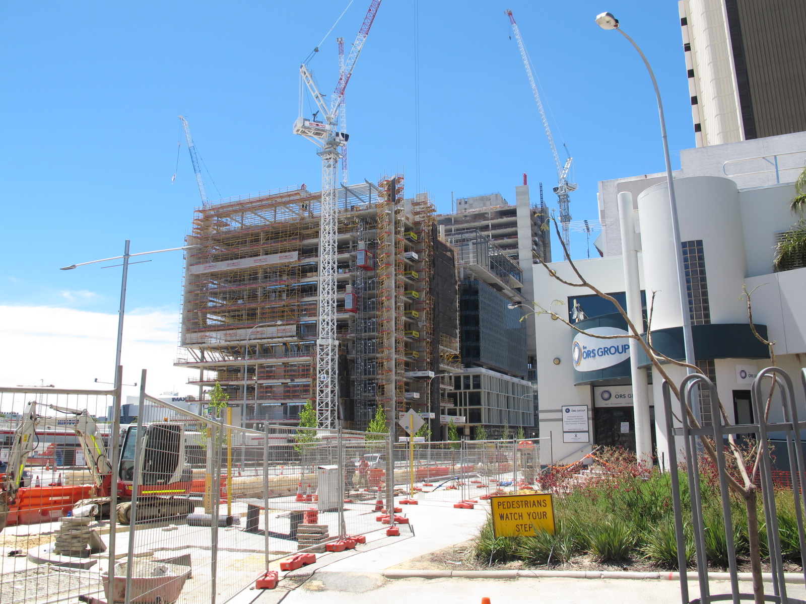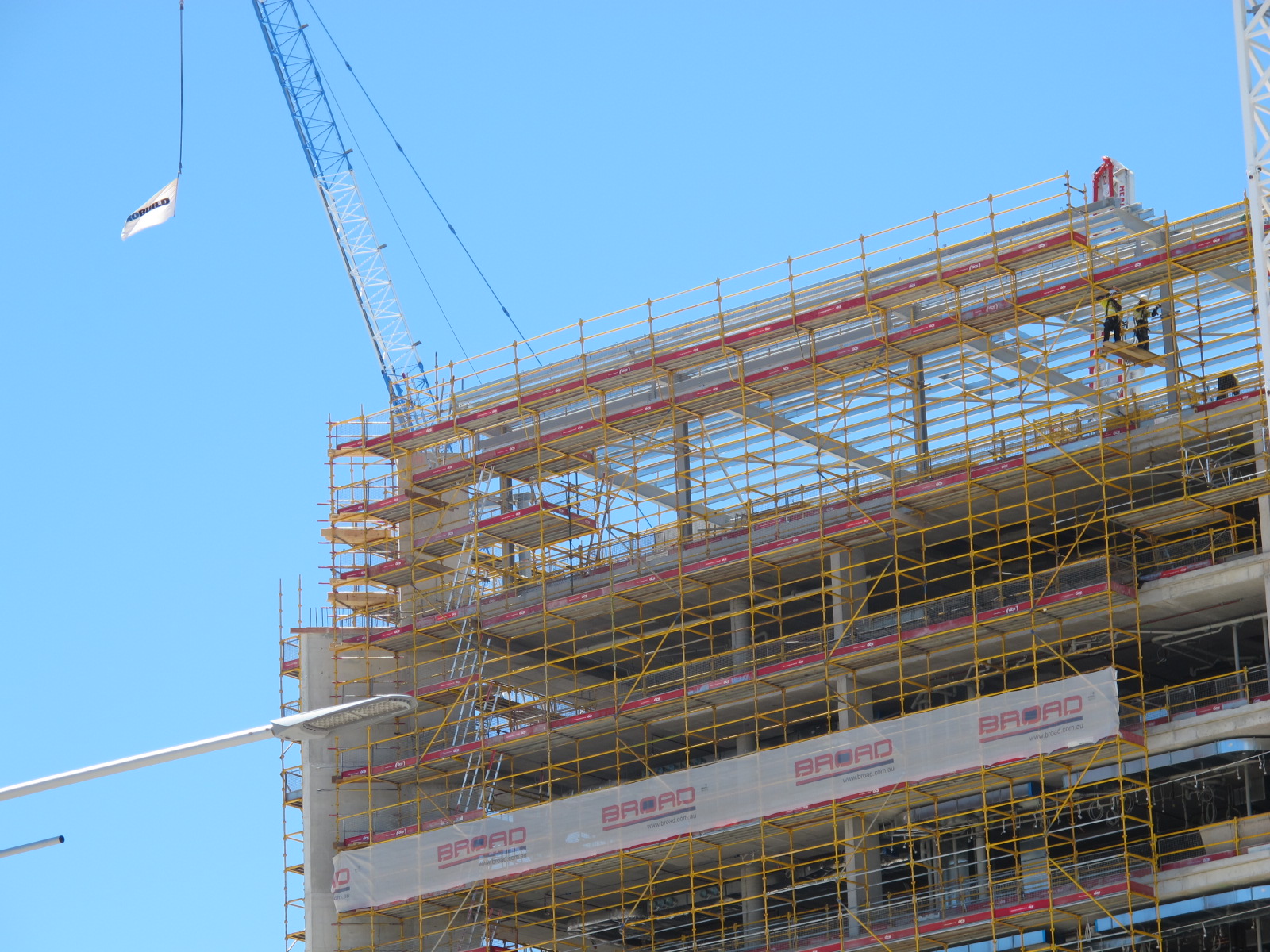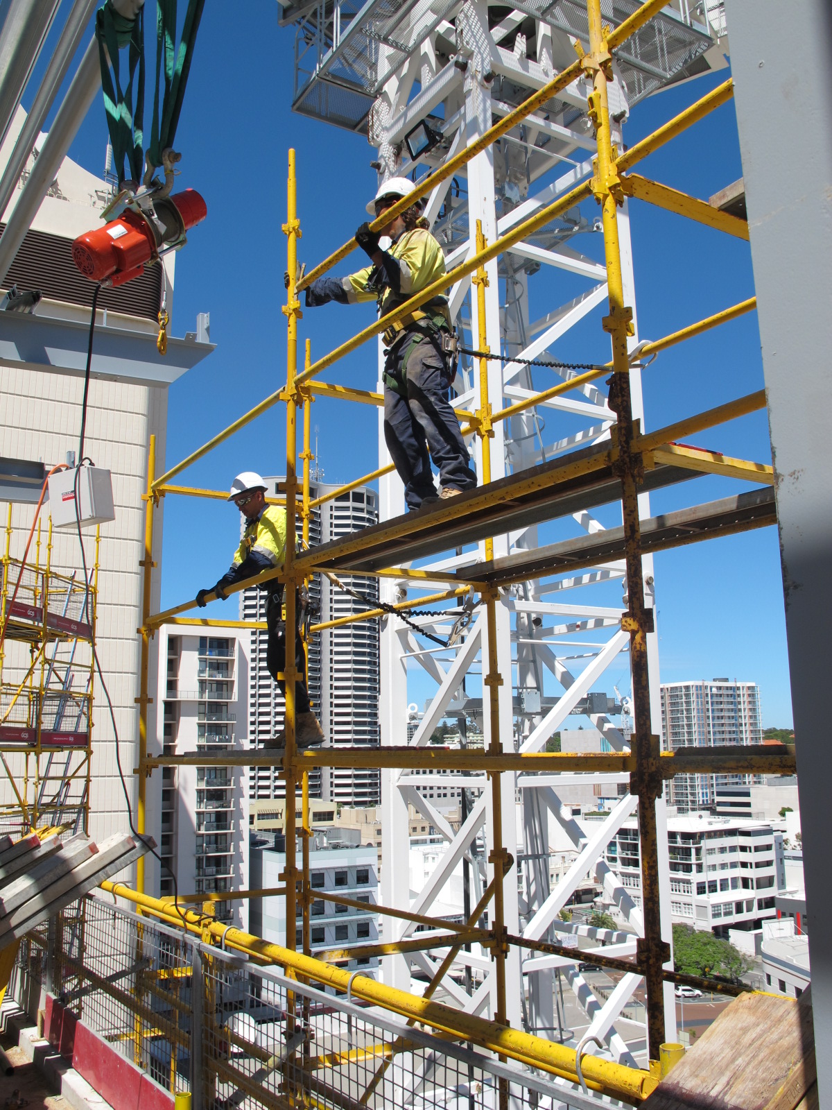 The Kings Square project was a very intricate build with 50m high scaffold built to all four side and external fins. Level 5 was backproped using engineered drawings then scaffold for the external perimeter was erected off this floor.